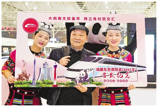 12月16日,在成都东站,乘坐成贵高铁首班车的乘客(中)在发车前留影。