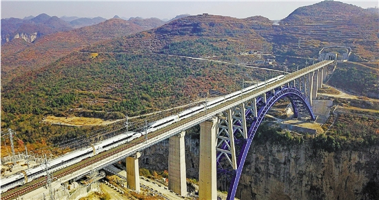 12月16日6时58分,成贵高铁首班车C6041从成都东站发车到贵阳。成贵高铁是我国“八纵八横”高速铁路网兰州(西宁)至广州通道的重要组成部分。线路在成都枢纽与西成高铁、成渝高铁连接,在贵阳枢纽与贵广高铁、沪昆高铁连接,沿途的川南宜宾、滇北昭通、黔西毕节等地区结束了没有高铁的历史。 新华社发 12月16日,一列动车组列车从成贵高铁西溪河大桥上驶过。 新华社发 |