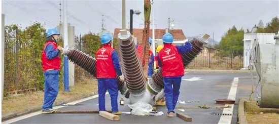 工作人员正在起吊穿墙套管 陈姣姣 摄
