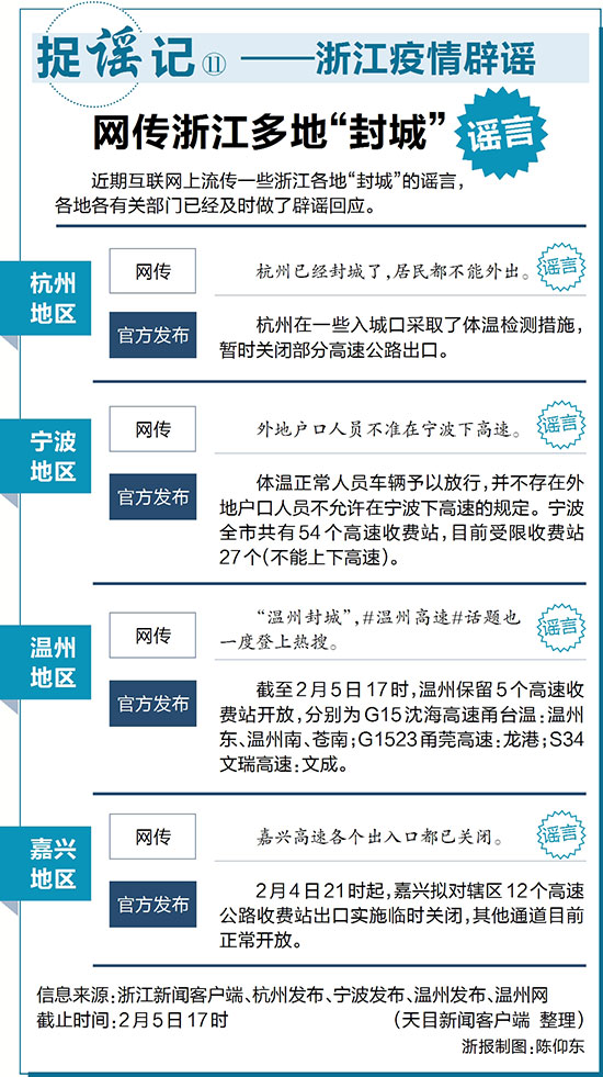 近期互联网上流传一些浙江各地“封城”的谣言,各地各有关部门已经及时做了辟谣回应。