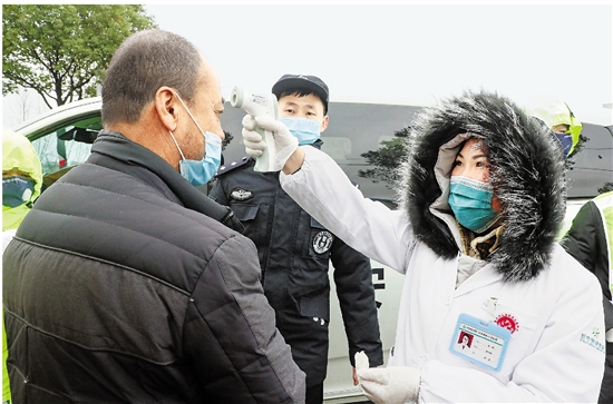 这几日,德清县钟管镇卫生院的党员医护人员王娟(右一)主动请战防疫一线。图为她在钟管镇士锦公路检测点对驾乘人员进行体温检测。 拍友 王正 摄