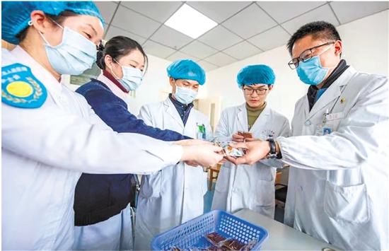 1月31日一早,中药房和煎药室加班加点精心煎制500余份汤剂,赠送到一线工作人员手中。 陈劲 摄