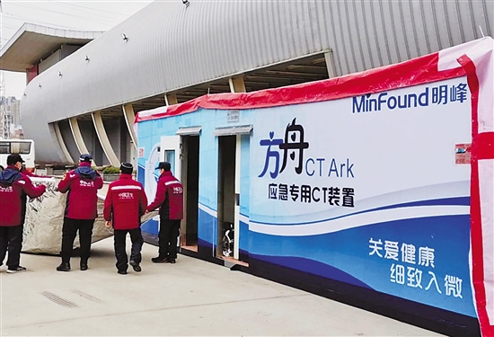 明峰医疗专门为抗击新冠肺炎(COVID-19)研制的国内首台车载方舟CT装置(方舱式应急专用CT整体解决方案),已在武汉客厅“方舱医院”投入使用。 冯靖龙 摄