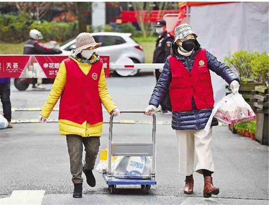 2月13日,杭州紫金港社区的志愿者帮住户把外卖和快递搬进圣苑小区。 本报记者 潘海松 摄