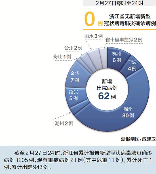 截至2月27日24时,浙江省累计报告新型冠状病毒肺炎确诊病例1205例,现有重症病例21例(其中危重11例),累计死亡1例,累计出院943例。
