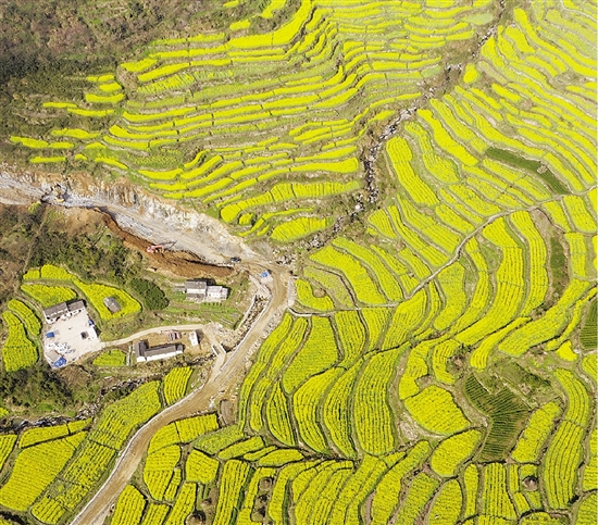 绍兴上虞区岭南乡覆卮山壮美的梯田油菜花。