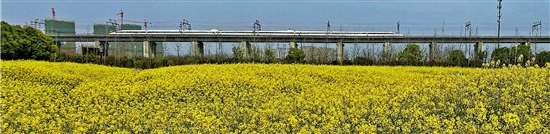 杭州萧山区机场城市大道附近大片油菜花盛开,远处是一辆开往春天的高铁列车。 本报记者 钱璐斌 周旭辉 摄