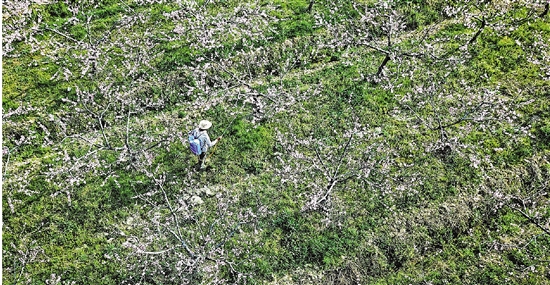 阳山畈村3000多亩桃花竞相绽放,果农在为桃树喷洒农药。