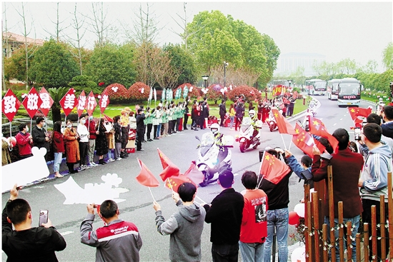 3月22日下午,安吉群众夹道欢迎我省援鄂医疗队第二批返浙人员。 拍友 方琪 摄