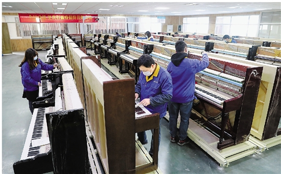3月27日,在德清县洛舍镇的乐韵钢琴有限公司组装车间,工人正在调试钢琴。目前全镇102家钢琴企业全部复工复产。 拍友 王树成 摄