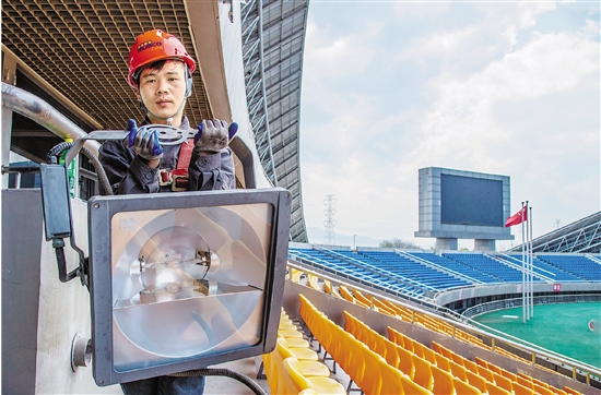 3月26日,金华市体育中心体育场,施工人员正登高更换灯光设施,实施亚运场馆灯光改造工程。 拍友 胡肖飞 摄