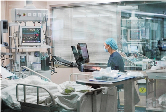 5月4日,在浙大二院滨江院区综合ICU,年轻护士正在为重症病人做护理。 拍友 邓国芳 童小仙 本报记者 周旭辉 摄