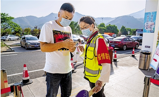 5月3日,诸永高速永嘉服务区客流升温,这里的防疫工作正有条不紊地进行着,青年志愿者提醒游客戴上口罩,做好疫情防控工作。 本报记者 李震宇 摄