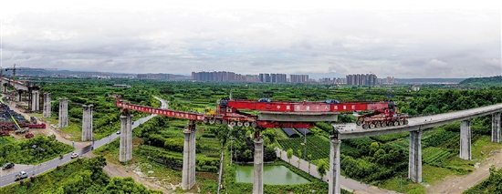 日前,杭绍台高铁嵊州特大桥上,施工人员用大推力机推送、吊装箱梁。据了解,该榀箱梁长32.6米,总重790.3吨。 拍友 张亮宗 摄