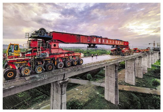 日前,杭绍台高铁嵊州特大桥上,施工人员用大推力机推送、吊装箱梁。据了解,该榀箱梁长32.6米,总重790.3吨。 拍友 张亮宗 摄