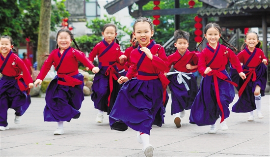 慈溪市观海卫镇城隍庙幼儿园的小朋友换上汉服来拍毕业照,千年鸣鹤古镇绽放朵朵笑脸。