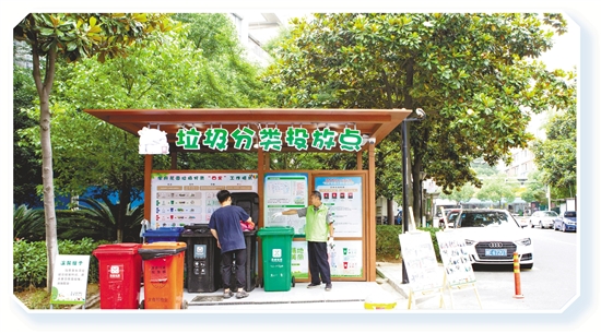 ← 6月17日,长兴县学府花园小区,垃圾分类专管员在“四定”集中投放点指导居民正确投放生活垃圾。 温在明 摄
