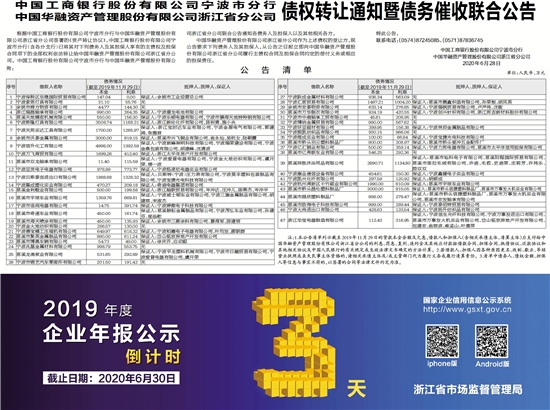 根据中国工商银行股份有限公司宁波市分行与中国华融资产管理股份有限公司浙江省分公司签署的《资产转让协议》,中国工商银行股份有限公司宁波市分行(含各分支行)已将其对下列债务人及其担保人享有的主债权及担保合同项下的全部权利依法转让给中国华融资产管理股份有限公司浙江省分公司。中国工商银行股份有限公司宁波市分行与中国华融资产管理股份有限公司浙江省分公司联合公告通知各债务人及担保人以及其他相关各方。