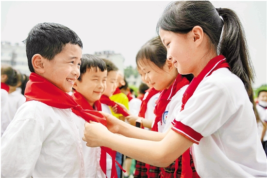 在安徽铜陵市义安区实验小学入队仪式上,高年级学生(右)为新入队队员系红领巾(6月1日摄)。 新华社发