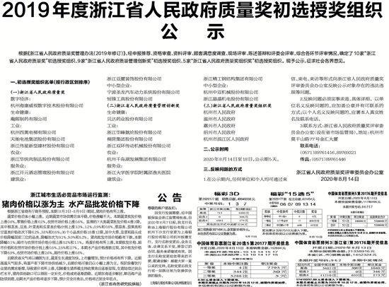 根据《浙江省人民政府质量奖管理办法(2019年修订)》,经申报推荐、资格审查、资料评审、顾客满意度调查、现场评审、陈述答辩和评委会评审,综合各环节评审情况,确定了10家“浙江省人民政府质量奖”初选授奖组织、9家“浙江省人民政府质量管理创新奖”初选授奖组织、5家“浙江省人民政府质量奖组织奖”初选授奖组织。现予公示,征求社会各界意见。