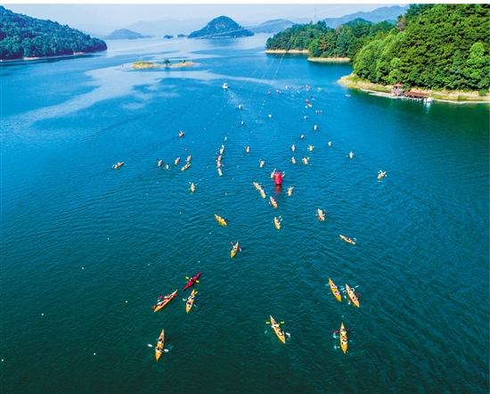 9月6日,“绿水青山大联动”迎杭州亚运会倒计时两周年主题活动从淳安千岛湖起航。千岛湖上百舸竞发,五颜六色的赛艇和皮划艇在青山环抱、碧水浸染中,勾勒出一幅秀美灵动的画卷。 拍友 王建才 摄