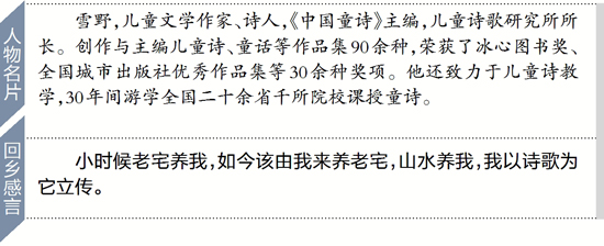 雪野,儿童文学作家、诗人,《中国童诗》主编,儿童诗歌研究所所长。创作与主编儿童诗、童话等作品集90余种,荣获了冰心图书奖、全国城市出版社优秀作品集等30余种奖项。他还致力于儿童诗教学,30年间游学全国二十余省千所院校课授童诗。