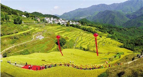 10月8日上午,金华市婺城区塔石乡举行农民丰收节暨丰收嘉年华活动。在金灿灿的梯田上,村民们用舞龙的方式庆祝水稻开镰。