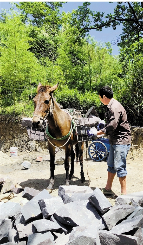 山路陡峭,施工队用骡子运材料。