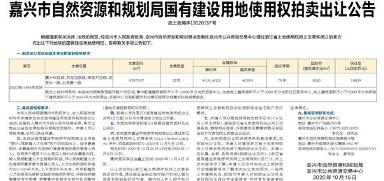 嘉兴市自然资源和规划局国有建设用地使用权拍卖出让公告