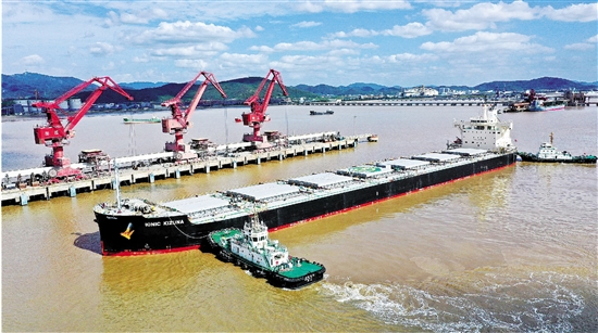 10月14日,新加坡籍的“艾奥尼克IONIC KIZUNA”轮停靠舟山老塘山港三期码头,卸载15402吨货物。据了解,今年前三季度,舟山港域货物吞吐量达4.34亿吨,同比增长7.08%,占宁波舟山港总吞吐量的近五成。 拍友 姚峰 齐妤晔 摄 |