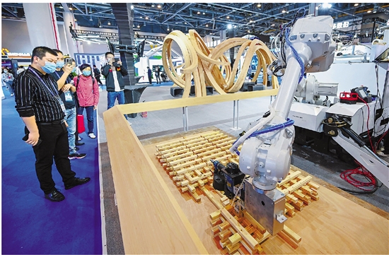 10月16日,第二届中国(杭州)国际智能产品博览会、2020全球人工智能大会在杭开幕。图为机器人在拼装木质构件。 本报记者 董旭明 叶怡霖 摄