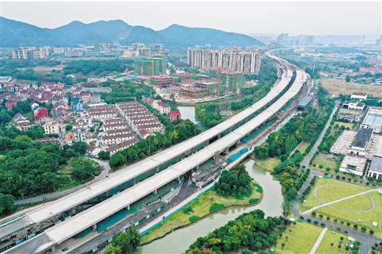 10月21日,空中俯瞰杭州时代大道改造工程,滨江段高架桥已经全线贯通,为年底高架具备通车条件奠定基础。时代大道改造工程(滨江段)高架桥北起白马湖路,南至滨江与萧山区界,全长1006米,是杭州绕城高速公路内“四纵五横三连一抬升”快速路网的重要组成部分。 本报记者 林云龙 摄 |