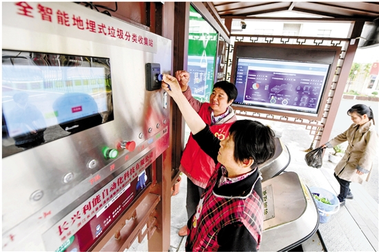 在虹星桥镇港口村全智能地埋式垃圾分类收集站,志愿者正在指导村民规范投放垃圾。 共享联盟长兴站 谭云俸 摄