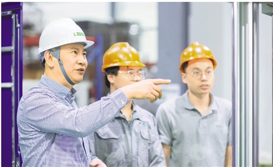 蒋迎峰(左一)和员工交流工作。 拍友 尤才彬 摄