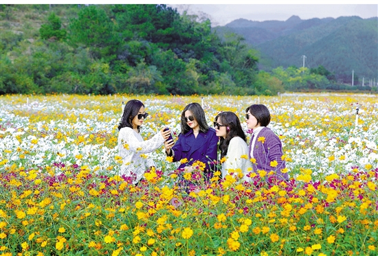 | 11月4日,在衢州市柯城区沟溪乡直力村“衢州花境”项目建设现场,波斯菊、格桑花、荞麦花竞相绽放,游客络绎不绝。据了解,该项目占地1300余亩,除了花海,还将打造集野生动物园、森林火车、山水实景大型夜幕灯光演艺秀于一体的文旅农融合综合性产业,撬动四省边际旅游大市场。 共享联盟柯城站 郑晨 本报记者 赵璐洁 摄 |