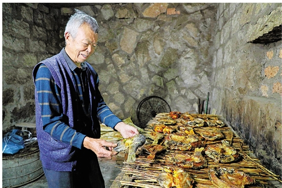 村民正在烘烤田鱼,经过腌制、蒸、烘烤的田鱼,口感鲜香酥脆。