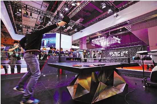 11月6日,一名男子在进博会上体验与乒乓球机器人对战。