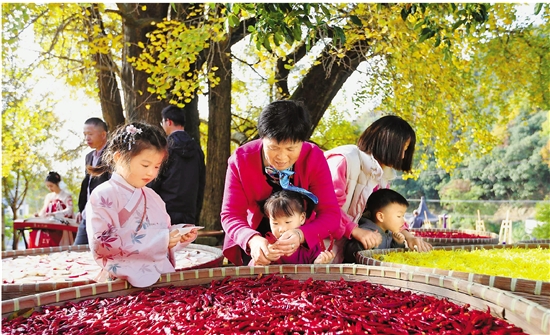 11月13日,在安吉县梅溪镇钱坑桥村,当地一棵千年银杏迎来最美观赏季。不少游客和村民纷纷来到银杏树下欣赏、游玩,感受最美银杏季。 拍友 夏鹏飞 摄