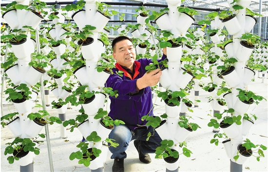 11月13日,工作人员在建德市“草莓小镇”的杨村桥“草莓智慧森林”种植基地培育管理立体支架上栽种的草莓秧苗。今年以来,当地在基地采用草莓新品种、微滴灌节水设施和温室立体基质栽培新技术,建成了集草莓育苗、种植、销售、观光、采摘于一体的综合性高效农业示范园,带动农民增收致富。 拍友 宁文武 摄 |