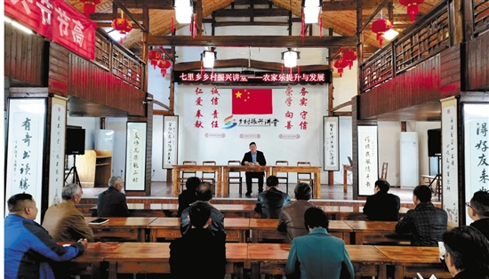 日前,柯城区七里乡桃源村支部书记、柯城区农家乐协会会长蔡建华在七里三村乡村振兴讲堂开讲,为群众们上了一节生动、系统的农家乐提升与发展培训课。 (陆慧成 摄)