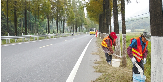 为保护公路行道树越冬,连日来,江山公路部门组织养护人员对全市公路行道树进行刷白,给树木穿上“暖衣”,应对即将到来的寒冷天气。 毛建华 摄
