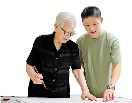 陪伴者朱越陪徐继兰老人画牡丹。 黄珍珍 摄