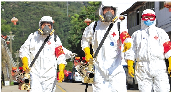 新冠肺炎疫情防控期间,应急搜救队展开消杀工作