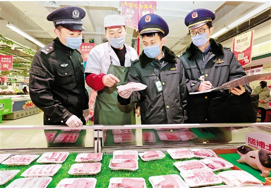 1月14日,岱山县公安局治安大队民警和县市场监管局执法人员在超市检查进口冷链食品。 拍友 邹训永 张志龙 摄
