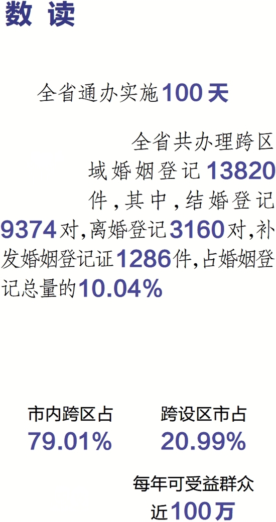 全省共办理跨区域婚姻登记13820件,其中,结婚登记9374对,离婚登记3160对,补发婚姻登记证1286件,占婚姻登记总量的10.04%