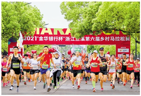 ◀4月11日,2021“金华银行杯”浙江兰溪第六届乡村马拉松赛欢乐开跑。