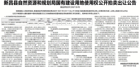 经新昌县人民政府批准,新昌县自然资源和规划局决定于2021年5月11日上午9时起(地块具体拍卖时间以网上交易系统为准),以网上拍卖方式公开出让位于新昌县七星街道新中路和演溪路交叉口东南侧地块的国有建设用地使用权(详见附表)。现将有关事项公告如下: