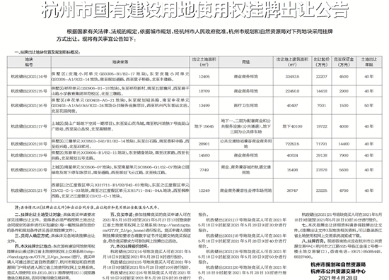 根据国家有关法律、法规的规定,依据城市规划,经杭州市人民政府批准,杭州市规划和自然资源局对下列地块采用挂牌方式出让。现将有关事宜公告如下: