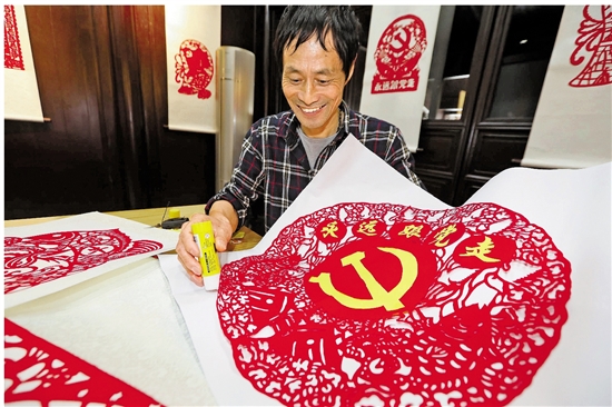 | 近日,宁波市镇海区招宝山街道的海洋剪纸非遗传承人、有34年党龄的陈士海创作完成了100幅红色主题的剪纸作品,他用这种特殊的方式庆祝中国共产党成立100周年。 本报记者 贺元凯 共享联盟镇海站 汤越 罗梦圆 摄 |
