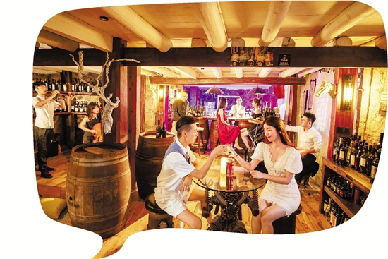 游客们在侨家乐民宿“水云涧”品尝红酒。